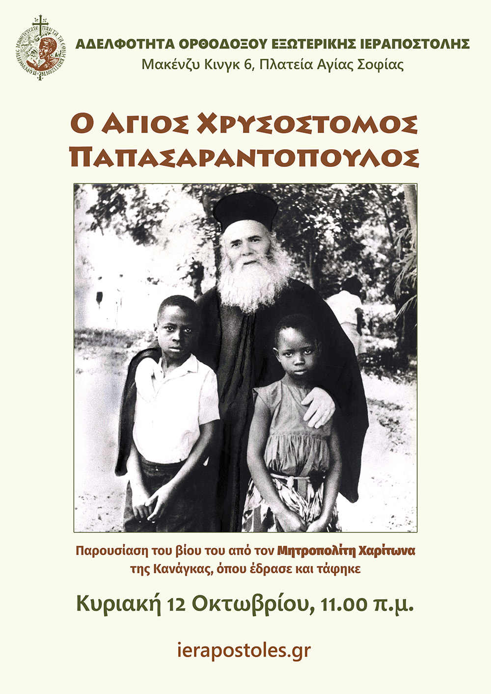 Η Αδελφότητα Ορθοδόξου Εξωτερικής Ιεραποστολής διοργανώνει εκδήλωση για τον νέο Άγιο της Ορθόδοξης Εκκλησίας Χρυσόστομο Παπασαραντόπουλο, την Κυριακή 12 Οκτωβρίου και ώρα 11.00 π.μ. στην αίθουσά μας (Μακένζυ Κινγκ 6, 3ος όροφος, Σταθμός Αγία Σοφία).