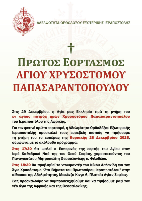 Η Αδελφότητα Ορθοδόξου Εξωτερικής Ιεραποστολής σας προσκαλεί την Κυριακή 28 Δεκεμβρίου 2025 να τιμήσουμε για πρώτη φορά τη μνήμη του Αγίου Χρυσόστομου Παπασαραντόπουλου, με δύο εκδηλώσεις: