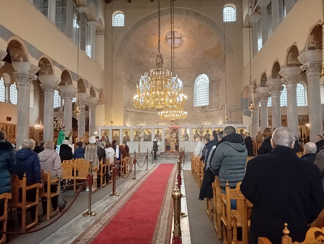 Προηγουμένως, ο Μητροπολίτης Πηλουσίου τέλεσε τη Θεία Λειτουργία στον Ιερό Ναό Παναγίας Αχειροποιήτου, όπου και κήρυξε στο πολυπληθές εκκλησίασμα.