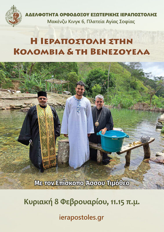 Την Κυριακή 8 Φεβρουαρίου η Αδελφότητα Ορθοδόξου Εξωτερικής Ιεραποστολής φιλοξενεί τον πρωτοπόρο ιεραπόστολο της Κολομβίας και της Βενεζουέλας, θεοφιλέστατο Επίσκοπο Άσσου κ. Τιμόθεο.