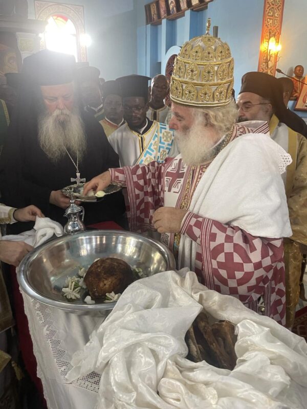 Στις 22 Μαρτίου ήρθε η μεγάλη στιγμή: Η ανακομιδή των ιερών λειψάνων του Αγίου Χρυσόστομου, του πρώτου ορθόδοξου ιεραποστόλου στην Αφρική. Ρίγη συγκίνησης κατέλαβαν όλους μας όταν οι αρχιερείς ανέσυραν από τον τάφο του Πατρός τα άγια λείψανα. Δεξιά και αριστερά οι τάφοι των άλλων ιεραποστόλων, και στη μέση ο Πατέρας Χρυσόστομος. Ο Πατριάρχης Αλεξανδρείας παρέλαβε ο ίδιος την αγία κάρα και αμέσως μού έδωσε να την ασπαστώ. Ακολούθησε το τυπικό κατά την παράδοση: το πλύσιμο των ιερών λειψάνων με ροδέλαιο, εν ψαλμοίς και ωδαίς, ο ραντισμός του πλήθους με μύρο, και η τοποθέτηση των τιμίων λειψάνων στη λάρνακα για προσκύνημα από τον λαό του Θεού.